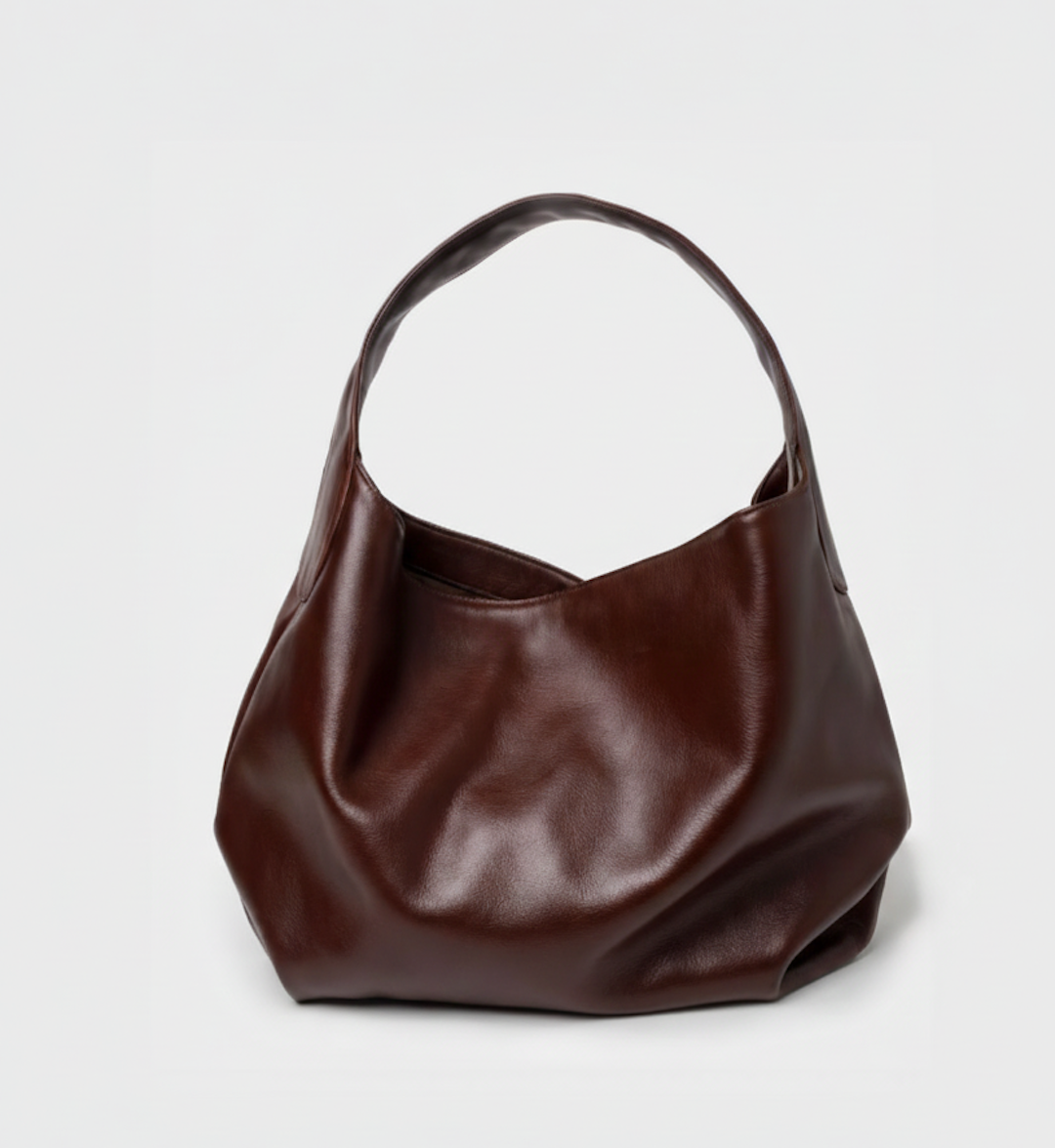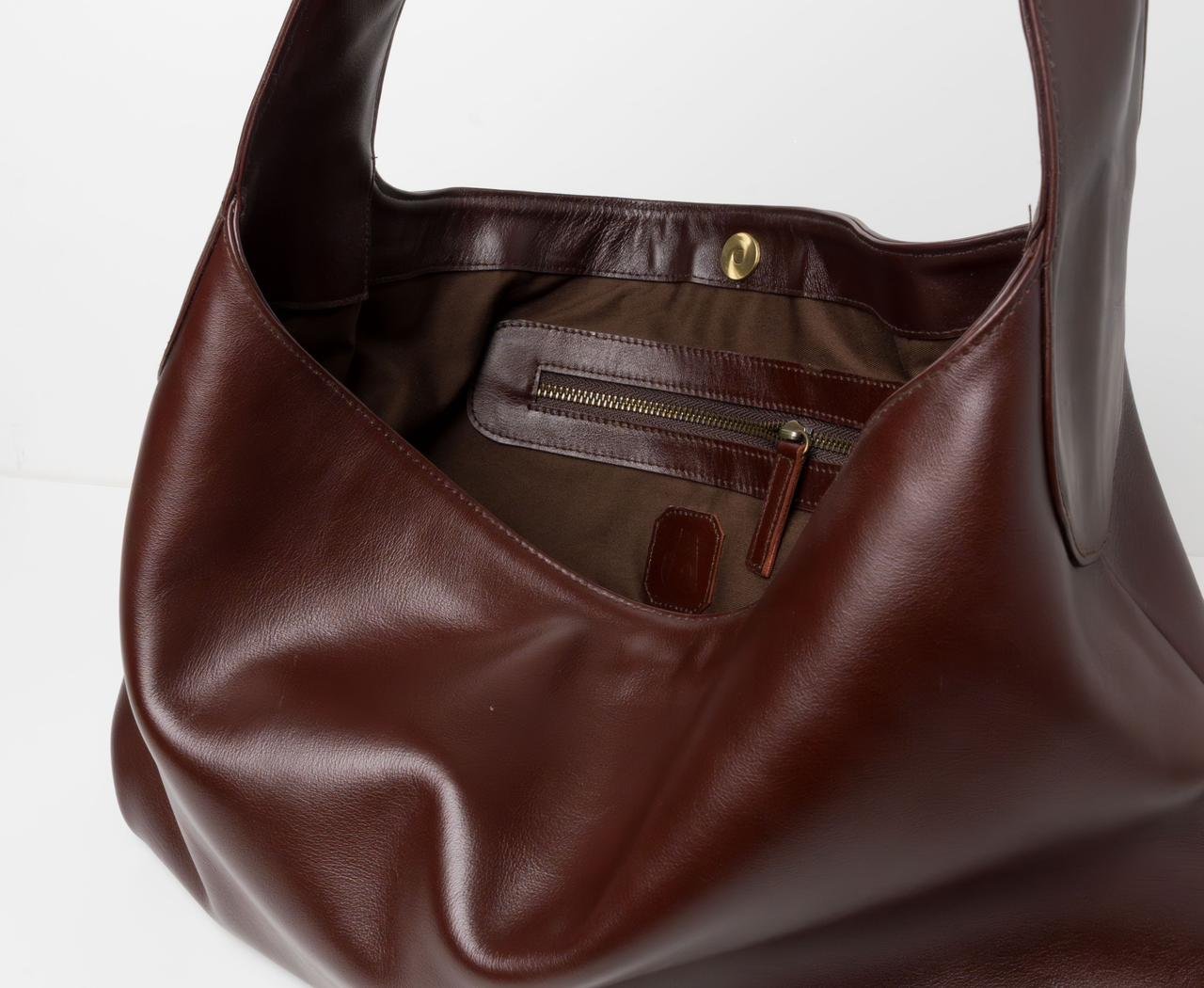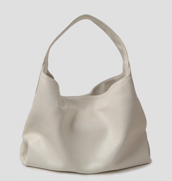 Slouchy shoulder bag in natural milled leather with curved lines, roomy interior, and concealed magnetic closure. Interior features a zip pocket and cotton fabric lining.