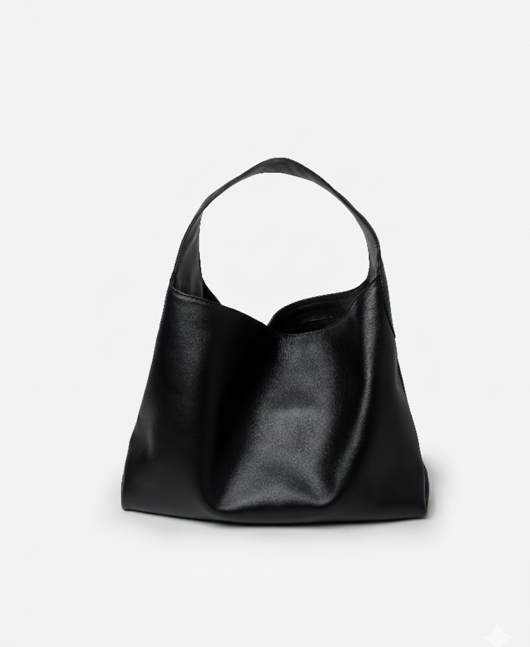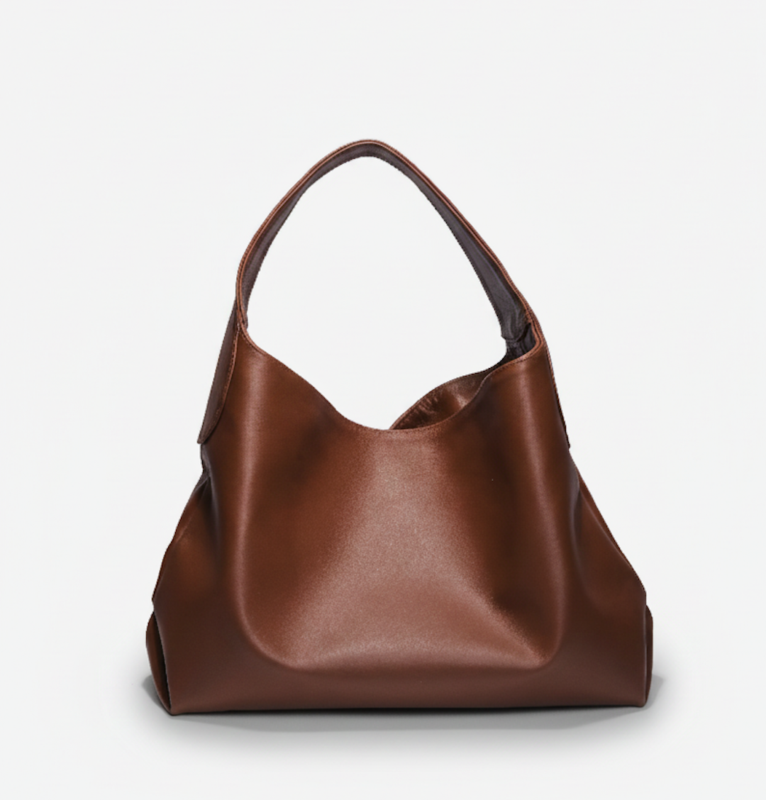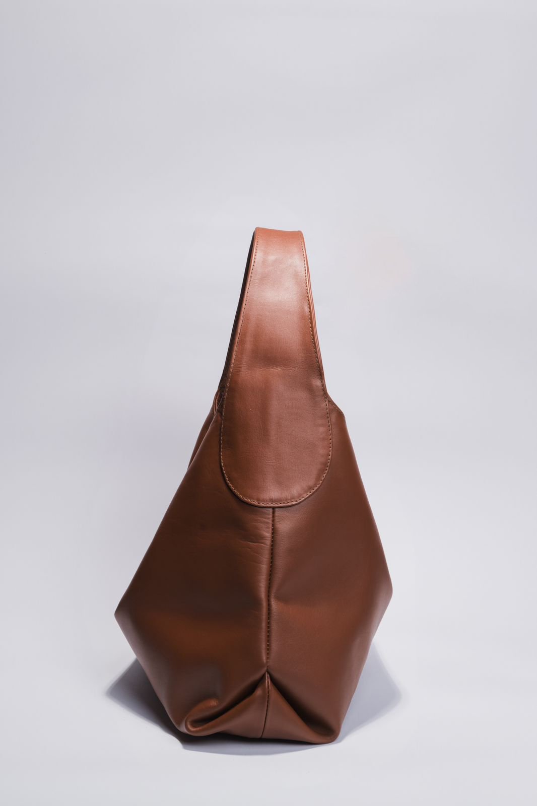 Slouchy shoulder bag in natural milled leather with curved lines, roomy interior, and concealed magnetic closure. Interior features a zip pocket and cotton fabric lining.