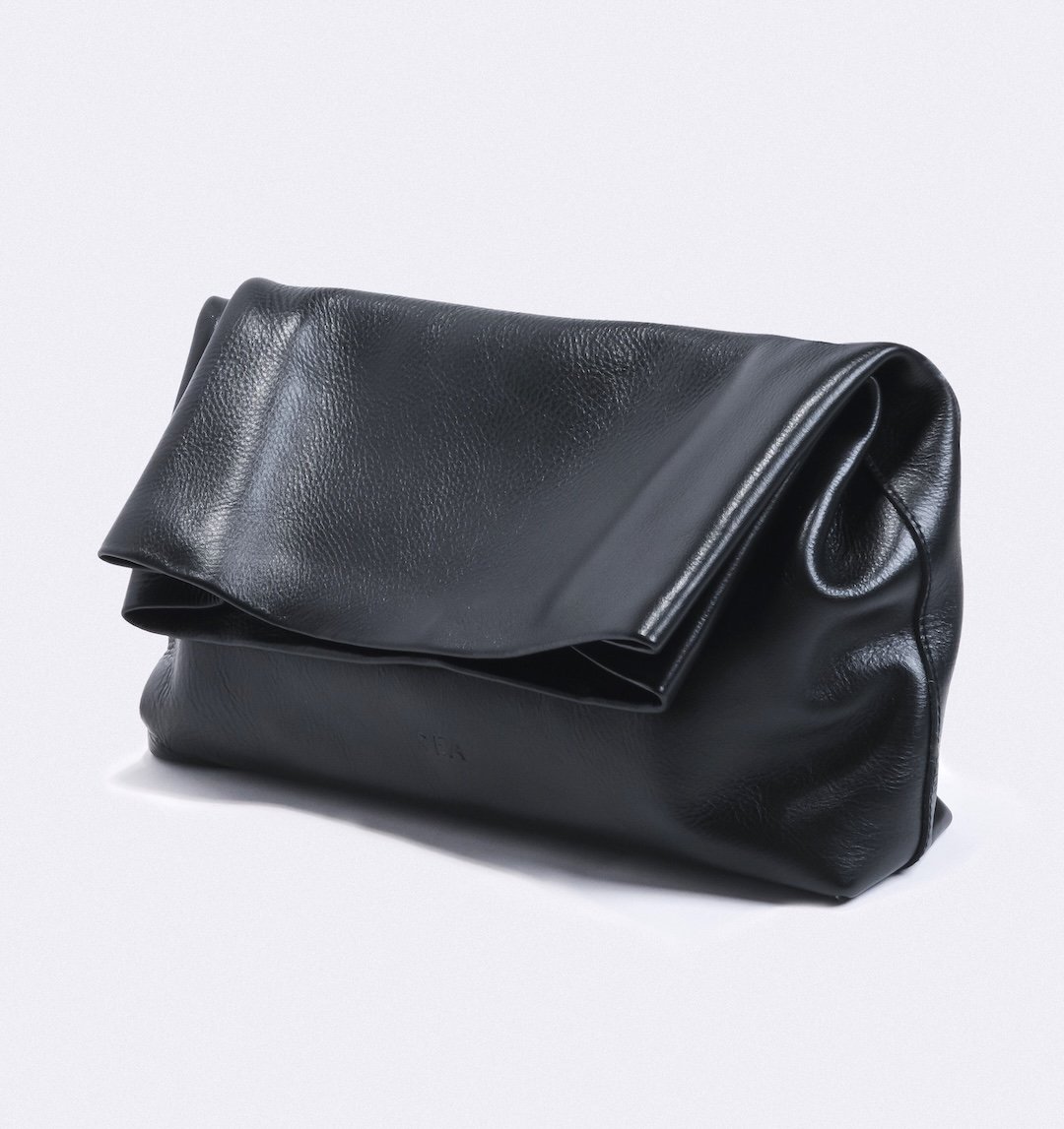 Soft-structured foldover clutch in natural milled leather with concealed magnetic closure. Interior features cotton fabric lining.