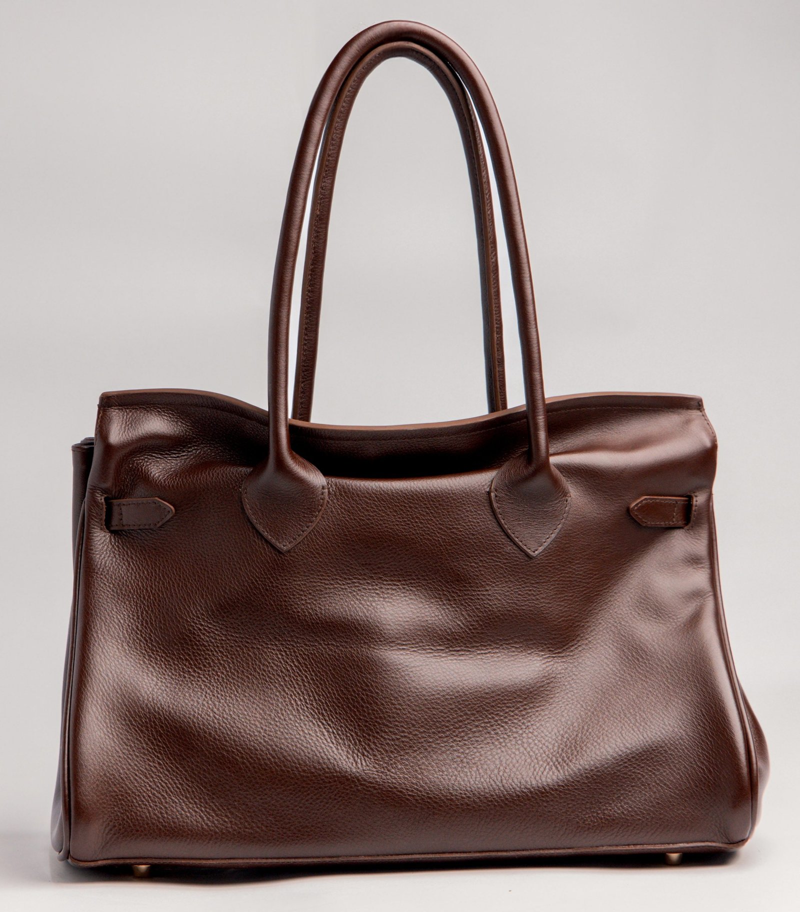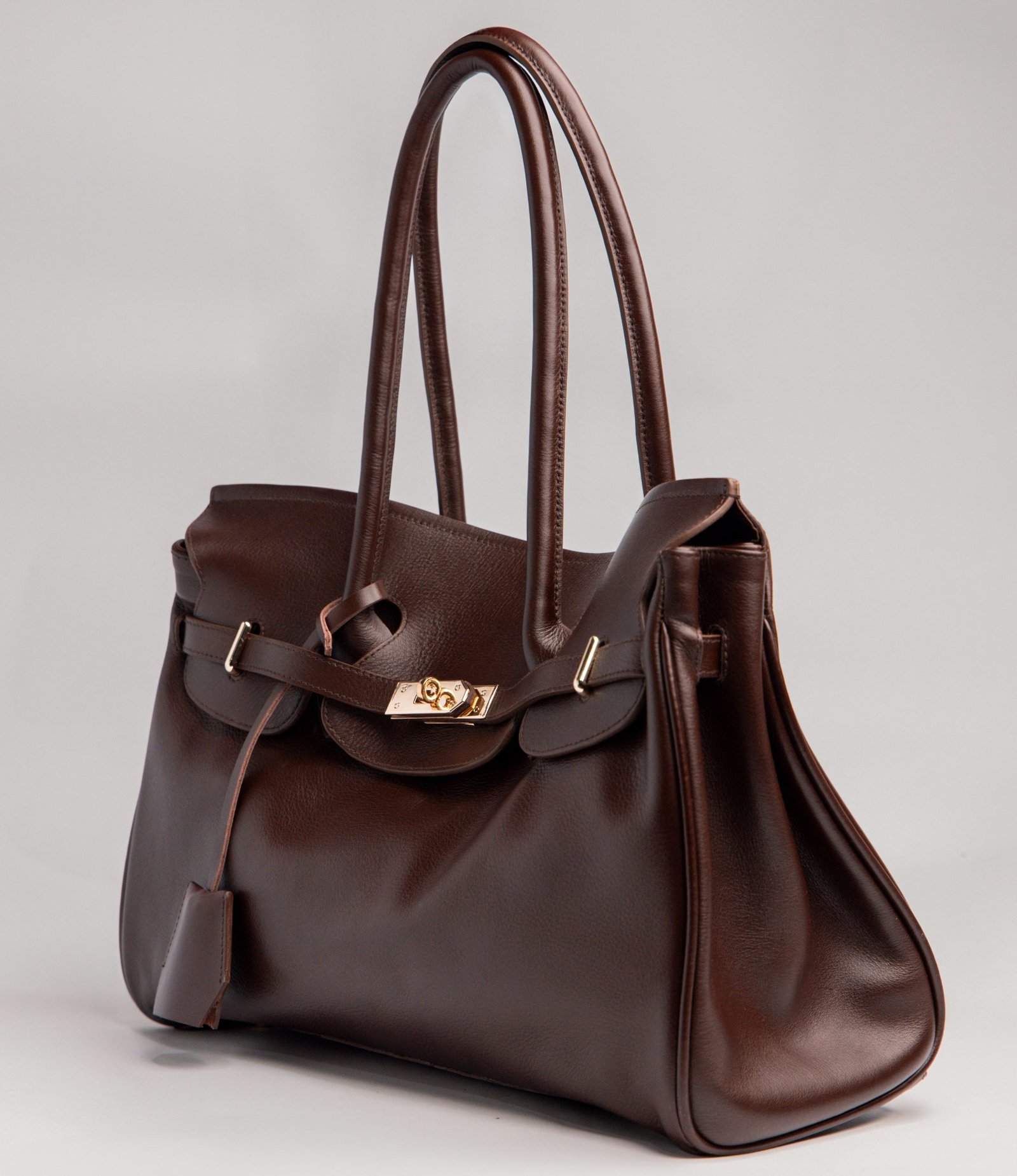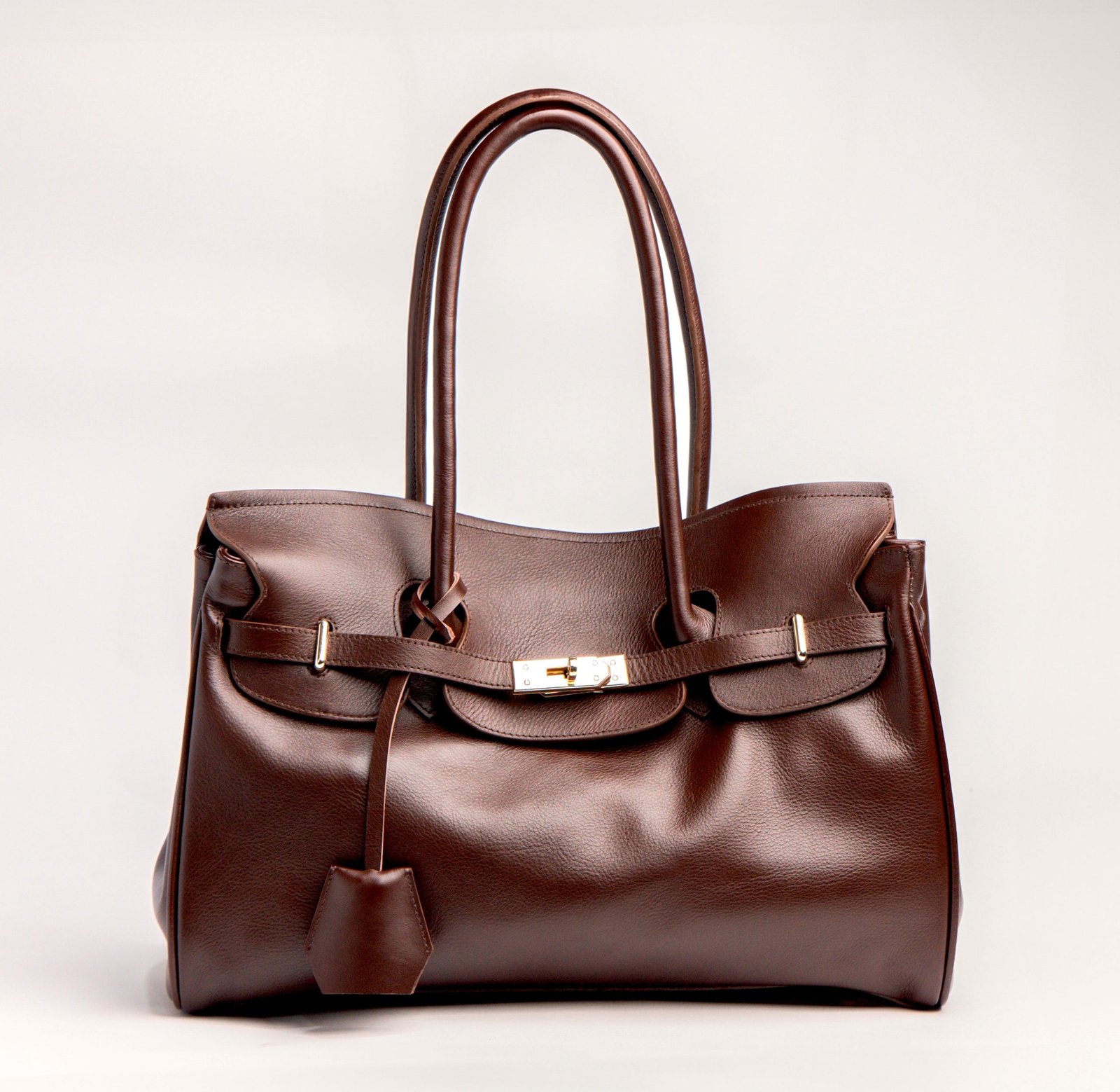 Soft-Structured shoulder bag in natural milled or pull-up leather with dual top handles, signature flap closure, and belted strap detail. Interior features a zip pocket and cotton fabric lining.