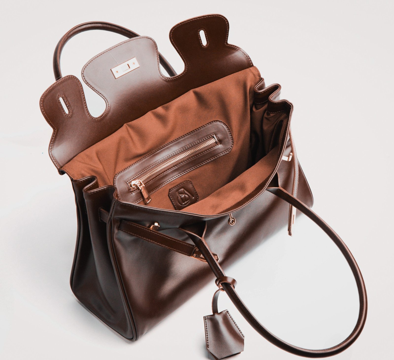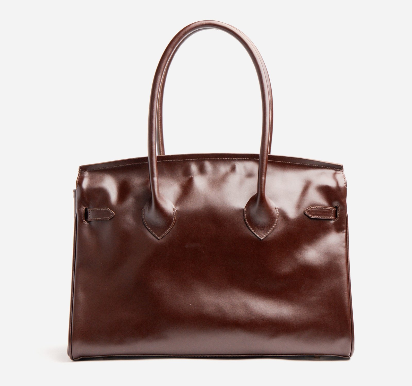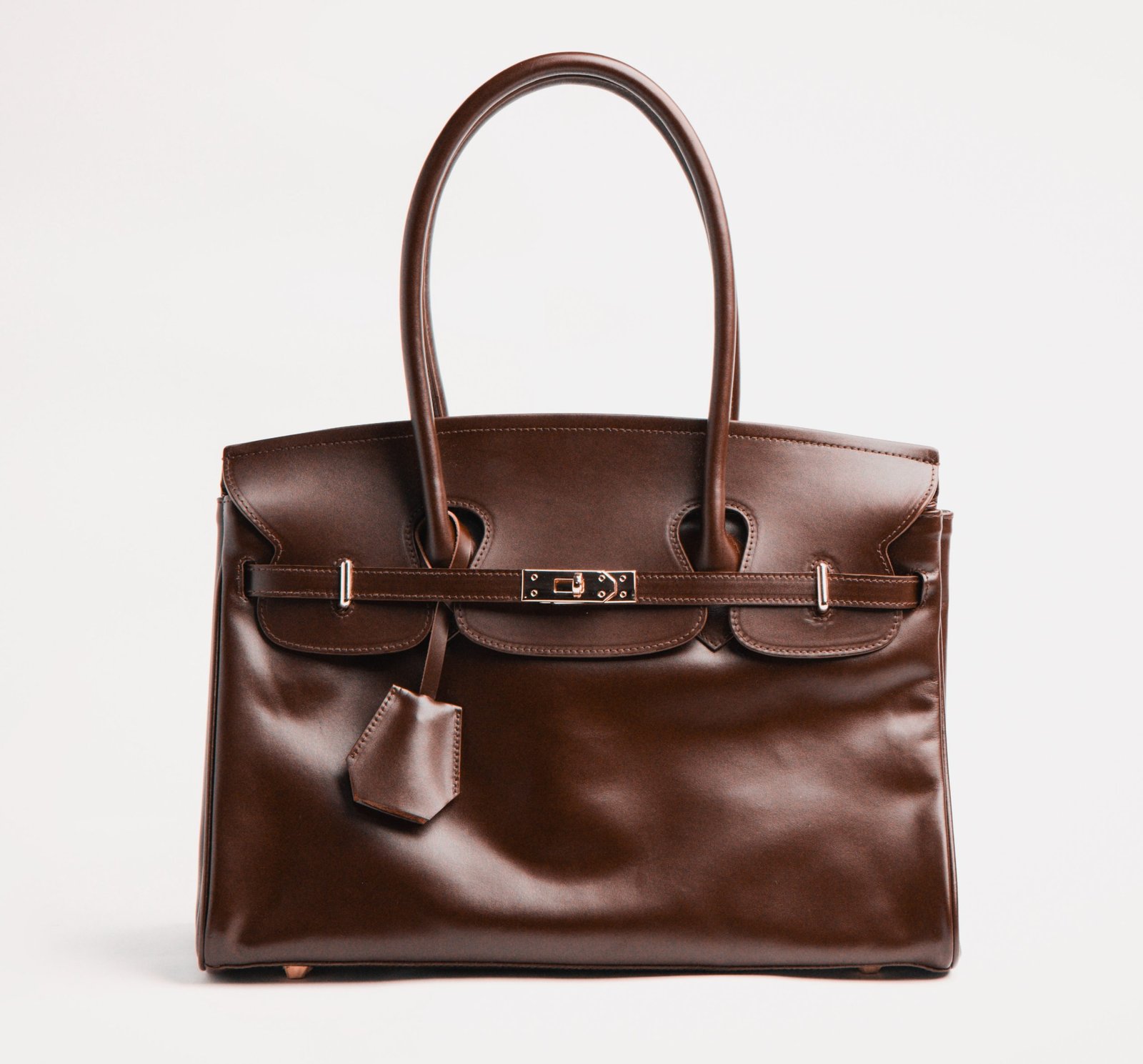 Soft-Structured shoulder bag in natural milled or pull-up leather with dual top handles, signature flap closure, and belted strap detail. Interior features a zip pocket and cotton fabric lining.