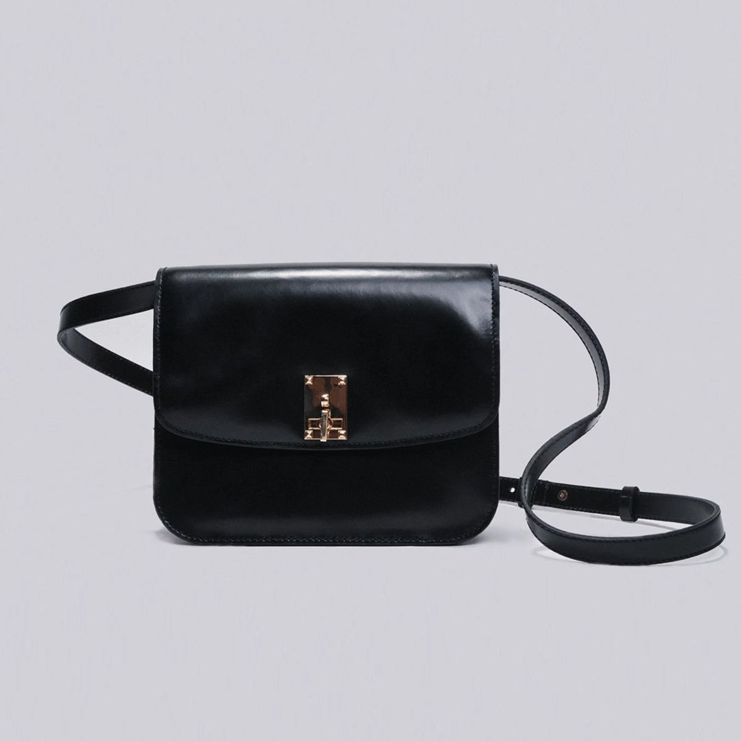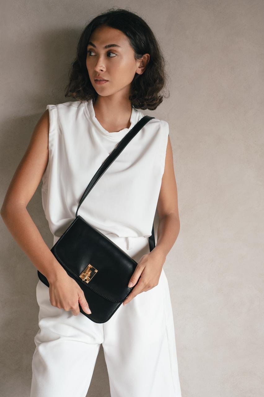 Compact sling bag in polished full-grain leather with structured silhouette, gold-tone push-lock closure, and adjustable strap.